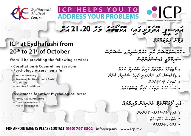 އިންސްޓިޓިއުޓް އޮފް ކައުންސިލިން އެންޑް ސައިކޯތެރަޕީ (އައިސީޕީ) ގެ ހިދުމަތްތައް ދިނުމުގެ ހާއްސަ ޕްރޮގްރާމެއް އޭދަފުށީގައި ބާއްވަން ނިންމައިފި އެވެ.