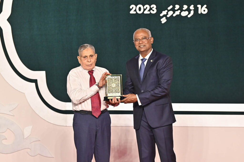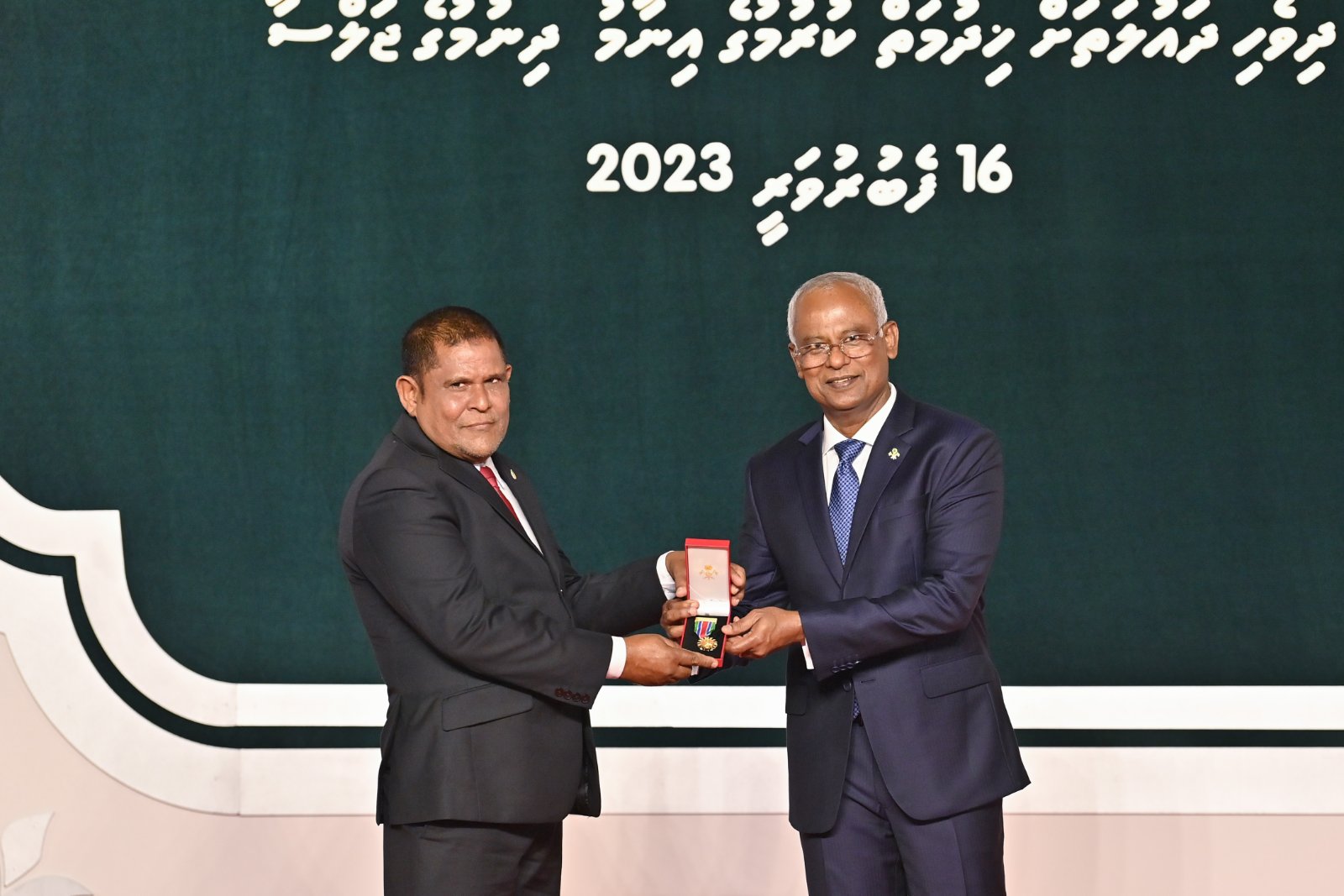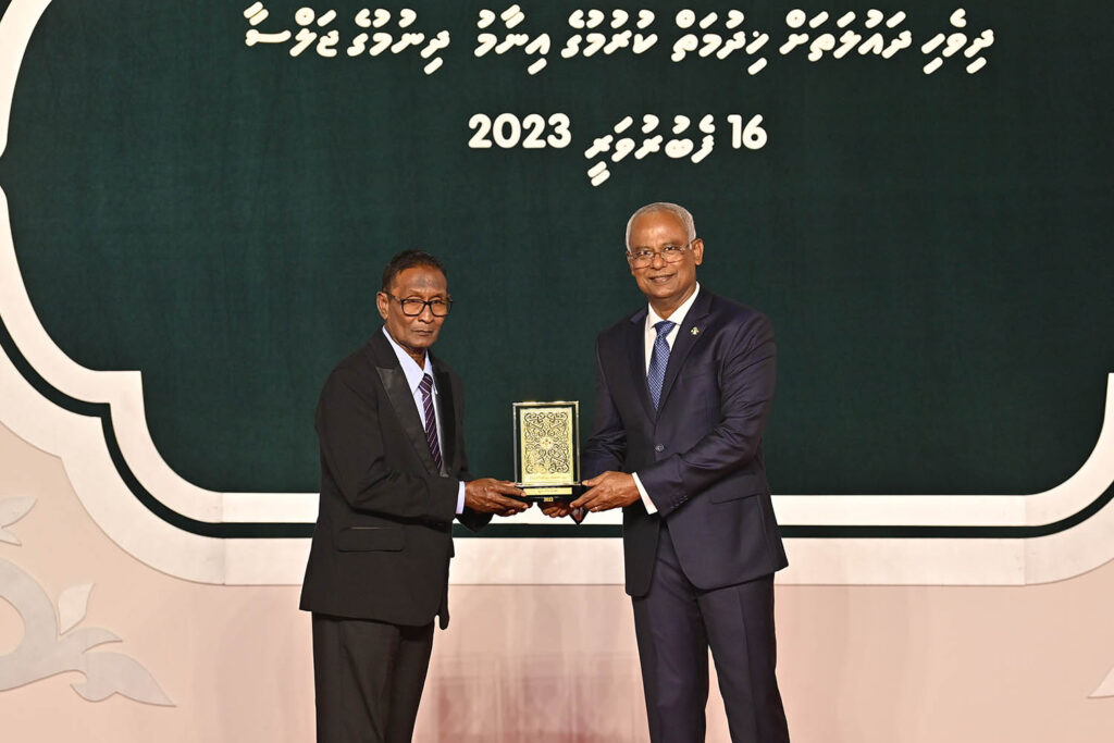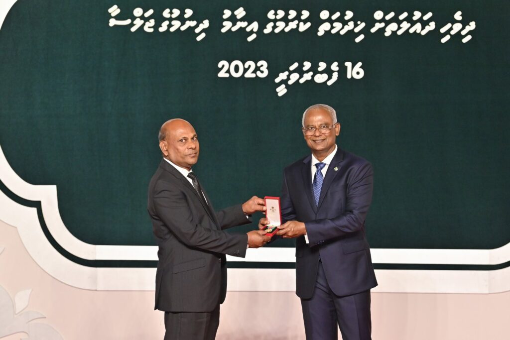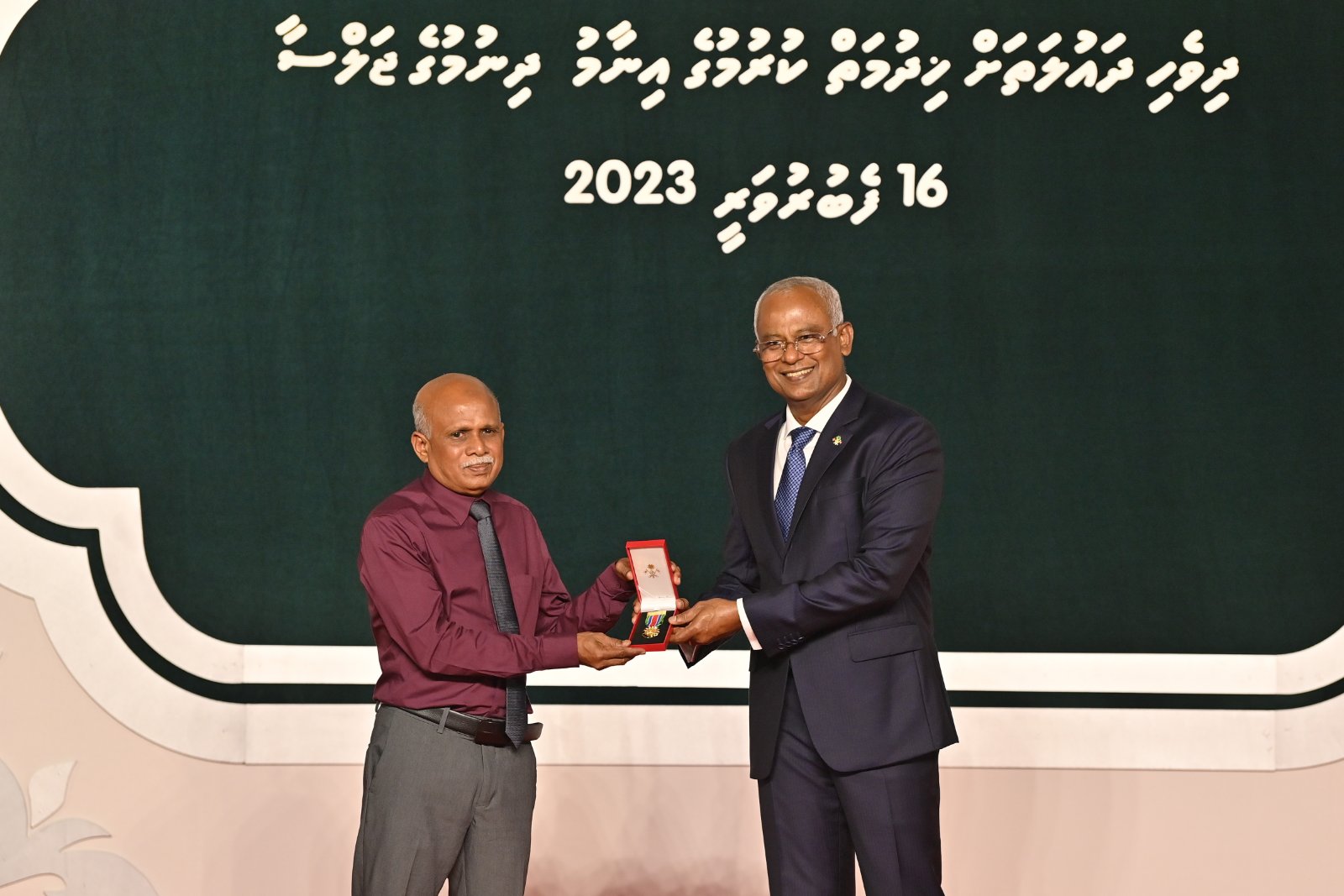 އެބޭފުޅުންނަށް ޝަރަފުގެ ބެޖާއި އައްޑަން ދެއްވީ ދިވެހި ދައުލަތަށް ހިދުމަތް ކުރުމުގެ އިނާމަށް 2022 ވަނަ އަހަރު ނަން ހުށަހެޅުއްވި ބޭފުޅުންގެ ތެރެއިން އިނާމު ދެއްވުމަށް ކަނޑައެޅުއްވި ބޭފުޅުންނަށް އިނާމު ދެއްވުމަށް މިރޭ ދަރުބާރުގޭގައި ބޭއްވި ރަސްމީ ޖަލްސާގަ އެވެ.