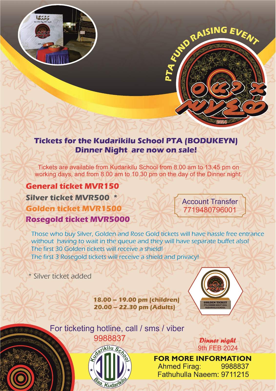 އަންނަ ހުކުރު ދުވަހުގެ ރޭ ބާއްވާ މި ޑިނާ ނައިޓަށް އާންމުކޮށް -/150 ރުފިޔާ އަށް ވިއްކާ ޓިކެޓްގެ އިތުރުން، އިތުރު ތިން ކެޓަގަރީއަކުން އަންނަނީ ޓިކެޓް ވިއްކަމުންނެވެ.