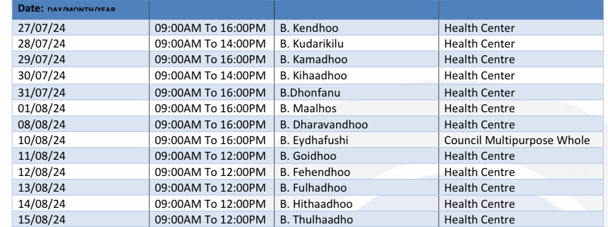 ކޭމްޕްގައި ޑޮކްޓަރަށް ދެއްކުމަށް ފުރިހަމަ ނަމާއި އައިޑީކާޑް ނަންބަރު އަދި އެޑްރެހާ ރަށާއެކު ގުޅޭނެ ނަންބަރާއެކު 7999602 އަށް މެސެޖް ކުރުމުން ނަންނޯޓް ކުރެވޭނެ އެވެ.