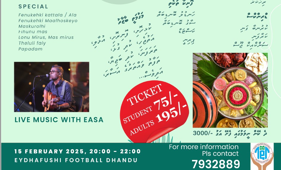 “ޕީޓީއޭ ޖާފަތް 2025” ނަމުގައި މިމަހުގެ 15 ވަނަ ދުވަހުގެ ރޭ 8:30 ން 10:00 އަށް އޭދަފުށީގެ ކުރީގެ ފުޓްބޯޅަ ދަނޑުގައި ބާއްވާ ޑިނާ ނައިޓުގައި މައިގަނޑު ގޮތެއްގައި ހިމެނޭނީ ދިވެހި ކެއުމުގެ ރަހަތައް ކަމަށް ޕީޓީއޭއިން ބުންޏެވެ.
