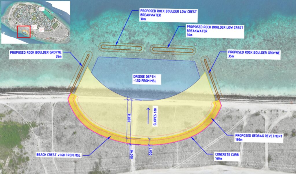 މި މަޝްރޫޢުގެ ދަށުން ކުރެވޭ މަސައްކަތްތަކުގެ ތެރޭގައި، މޫދަށްއެރޭ ސަރަހައްދު ހެދުމަށް 15,914 ކިއުބިކް މީޓަރުގެ ސަރަހައްދެއް ފުންކުރުމާއި، 160 މީޓަރުގެ ސަރަހައްދެއްގައި ޖިއޯބޭގް ރިވެޓްމަންޓް ޖެހުމާއި، 60 މީޓަރުގެ ބޮޑުހިލައިގެ ބޭރުތޮށި ޖެހުމާއި، 70 މީޓަރުގެ ގްރޮއިން ޖެހުމުގެ މަސައްކަތް ހިމެނެއެވެ.