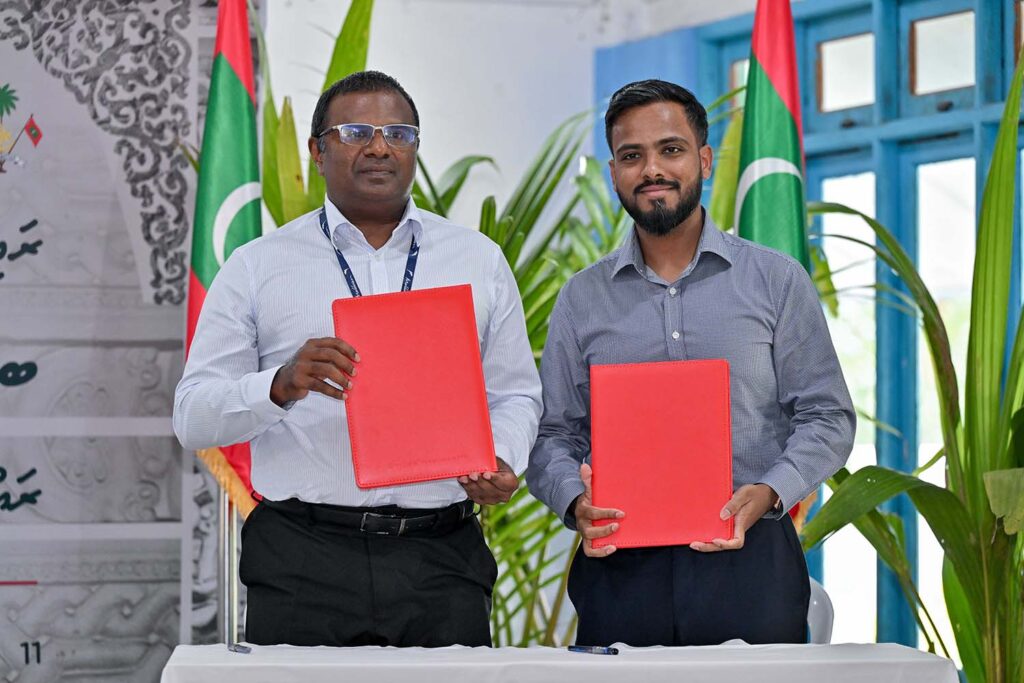ރައީސް މުހައްމަދު މުއިއްޒު ބ. އަތޮޅަށް މިއަދު ފެއްޓެވި ދަތުރުފުޅުގެ ތެރެއިން ކަމަދޫ ރައްޔިތުންނާ އެކު ބޭއްވެވި ބައްދަލުވުމުގައި މި އެއްބަސްވުމުގައި ސޮއިކުރެއްވީ ހޯކްސް ހޮޓެލްސްގެ ފަރާތުން ޑިރެކްޓަރު ހުސެން އަމަނާއި އައިލެންޑް އޭވިއޭޝަންގެ ފަރާތުން އެ ކުންފުނީގެ މެނޭޖިން ޑިރެކްޓަރު އިބްރާހިމް އިޔާސްއެވެ.