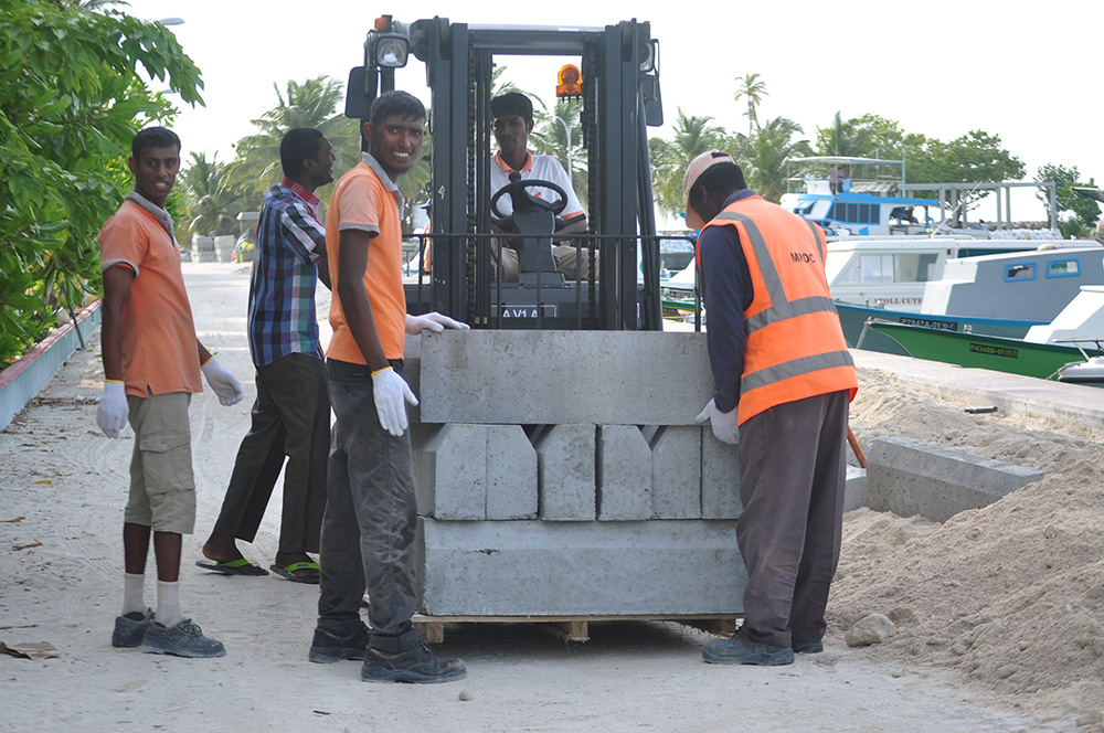 ބަނދަރު މަގުގެ ޕޭވްމަންޓް އަރިމަތީގައި ޖަހާ ކާބުތަށް ފޯކްލިފްޓުން ބޭލުމުގެ މަސައްކަތް އެމްއާރުޑީސީގެ މުވައްޒަފުން ކުރަނީ | އީޓީ ފޮޓޯ:ރާއިފް ޔޫސުފް