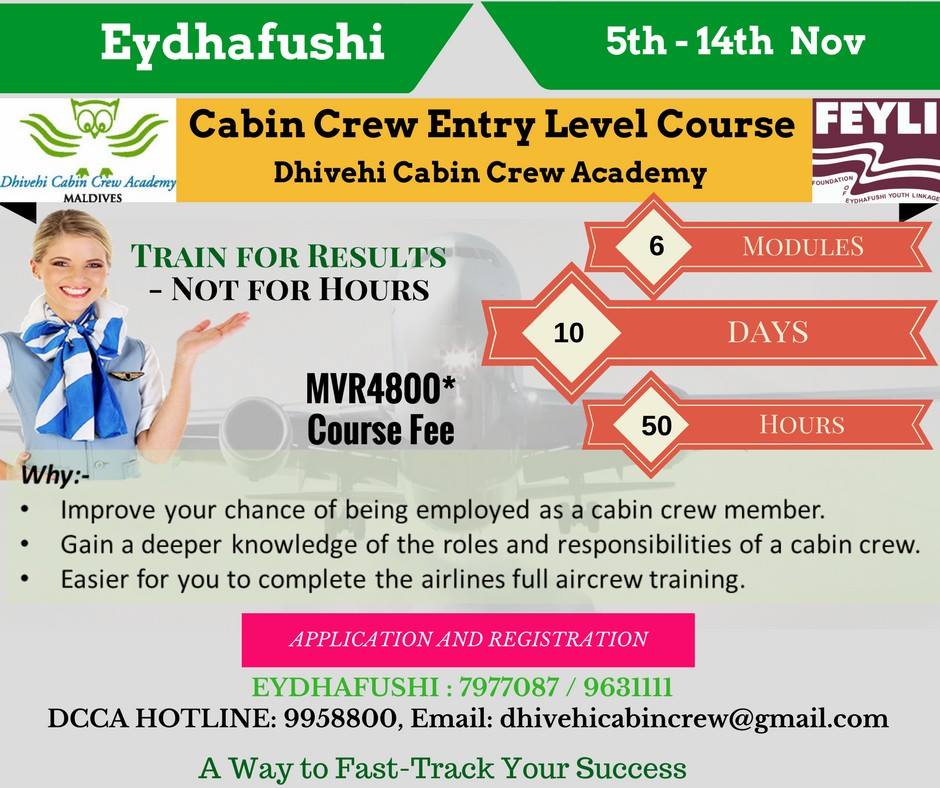 ކެބިން ކްރޫ ނުވަތަ ފްލައިޓް އެޓެންޑެންޓަކަށް ވާން ބޭނުން ހެއްޔެވެ؟ އެހެންކަމަށްވާނަމަ މިއޮތީ އެކަމަށް އޮތް ވަރަށް ފަހި ފުރުޞަތެކެވެ. ކެބިން ކުރޫން ތަމްރީން ކުރުމަށް ދިވެހި ކެބިން ކްރޫ އެކެޑެމީ (ޑީސީސީއޭ) އާއި ފޭލި ޖަމިއްޔާ ގުޅިގެން އޭދަފުށިގައި ކެބިން ކްރޫ ކޯހަކަށް މިވަނީ ފުރުސަތު ހުޅުވާލައިފަ އެވެ.