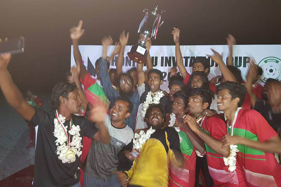 ދޮންފަނު އިންވިޓޭޝަން ކަޕް ފުޓްބޯޅަ މުބާރާތުގެ ފައިނަލުގައި ޕެނަލްޓީ ޖަހައިގެން 10-9 އިން އޭދަފުށި ބަލިކޮށް މުބާރާތުގެ ޗެމްޕިއަންކަން ގޮއިދޫ ހޯދައިފިއެވެ. މެޗުގެ ފުރިހަމަ ވަގުތު ހަމަވިއިރު ދެޓީމު އެއްވަރުވީ 3-3- އިންނެވެ. މިއަދުގެ މެޗުގައި އޭދަފުށި ޓީމުން ވަނީ މޮޅަށް ކުޅެ ގިނަ ހަމަލާތަކެއް އުފައްދާފައެވެ. މި މެޗަކީ އަތޮޅު ފުޓްބޯޅައިގައި މިހާތަނަށް ކުޅުނު އެންމެ ފޯރިގަދަ މެޗެވެ. މިއަދުގެ މެޗު ބެލުމަށް ވަރަށް ގިނަ އަދަދެއްގެ މީހުން ދޮންފަނަށް ގޮސްފައިވެއެވެ.