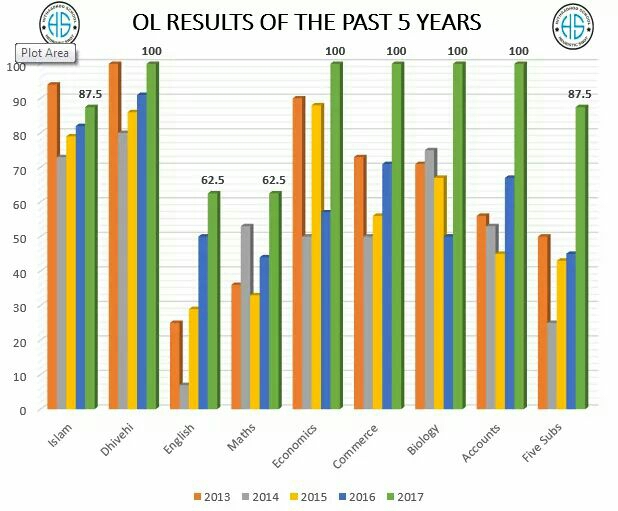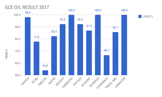 މިދިޔަ އަހަރު އެ ސްކޫލުން 53 ކުދިން އޯލެވެލްގައި ބައިވެރިވި އިރު އޭގެ ތެރެއިން 85 ޕަސެންޓް ކުދިން ވަނީ ފަސް މާއްދާ އަށް ވުރެ އިތުރަށް ފާސްވެފަ އެވެ. މިއީ ކުރީ އަހަރަށްވުރެ 7 ޕަސެންޓްގެ ކުރިއެރުމެކެވެ. އަދި އޭ ޕްލަސް އިން ފެށިގެން ސީ ގްރޭޑް ހޯދި ދަރިވަރުންގެ އަދަދު އިތުރުވެފައިވާއިރު ޔޫ ގްރޭޑް ނުވަތަ އެއްވެސް މާއްދާއަކުން ފާސްނުވާ ދަރިވަރުންގެ އަދަދު ވަނީ ދަށްވެފަ އެވެ.