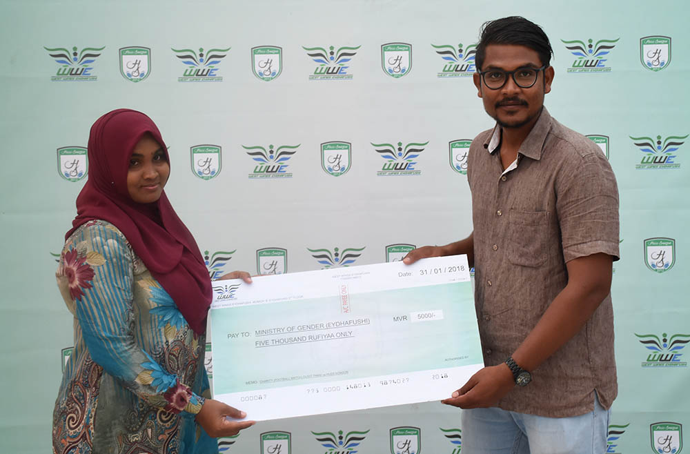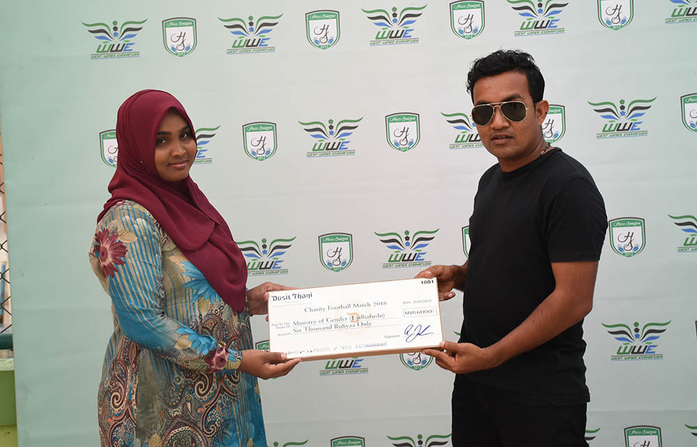 “ކޮމިއުނިޓީ ޗެރިޓީ ޝީލްޑް” ގެ ނަމުގައި ވެސްޓް ވިންގް ޖަމިއްޔާއިން އޭދަފުށީގައި ފުރަތަމަ ފަހަރަށް ބޭއްވި ހާއްސަ ފުޓްބޯޅަ މެޗުން ބ. އަތޮޅު ފެމިލީ އެންޑް ޗިލްޑްރަންސް ސާވިސް ސެންޓަރަށް 11،000 ރުދިޔާ ހަދިޔާކޮށްފި އެވެ.