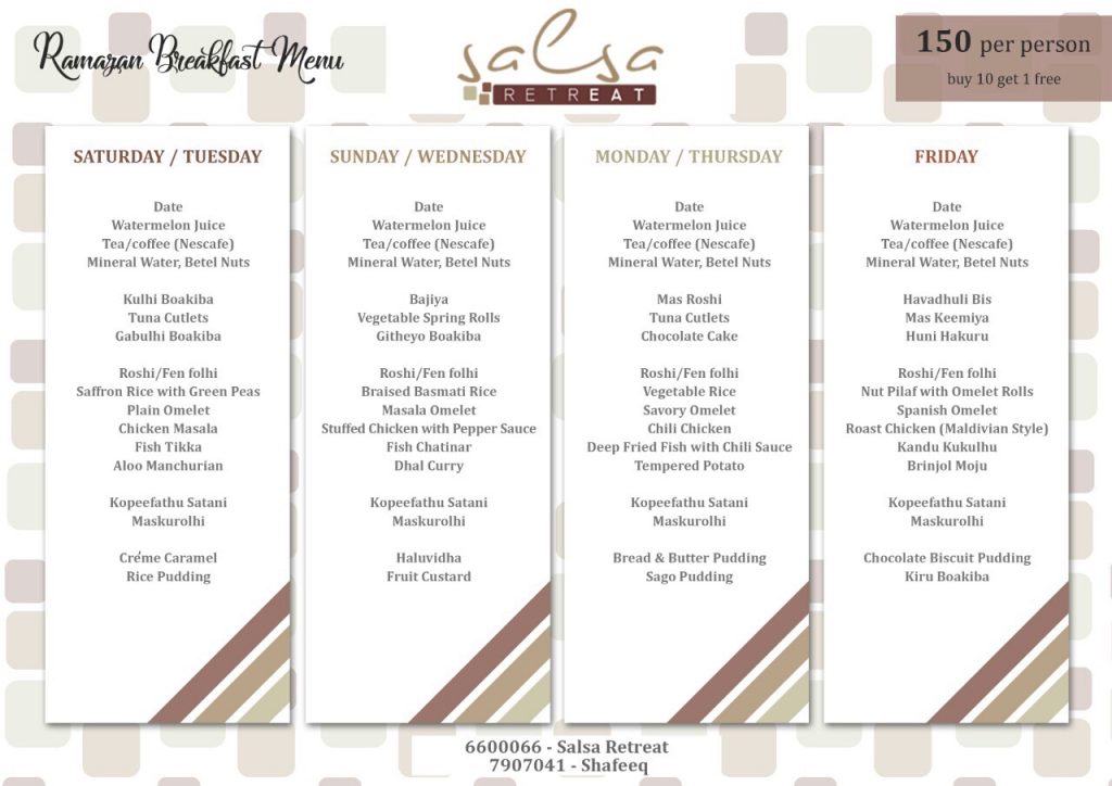 ސަލްސާ ރިޓްރީޓުން މި ރޯދަ މަހަށް ނެރެފައި ވަނީ އެންމެ ގިނަ ވައްތަރުތައް ހިމެނޭ އެއް މެނޫ އެވެ. ރޯދަ ވީއްލަން އެންމެ ގިނަ މީހުން ބޭނުން ވާނެ ތަފާތު ވައްތަރުތައް ހިމަނާފައިވެ އެވެ. އެ ގޮތުން، އާއްމުކޮށް ރޯދަ ވީއްލަން ބޭނުން ކުރާ ދިވެހި ކެއުންތައް ކަމަށްވާ ރޮށްޓާއި ތަފާތު ވައްތަރުތަކުގެ ހެދިކާ ވެސް ހިމަނާފައިވެ އެވެ.
