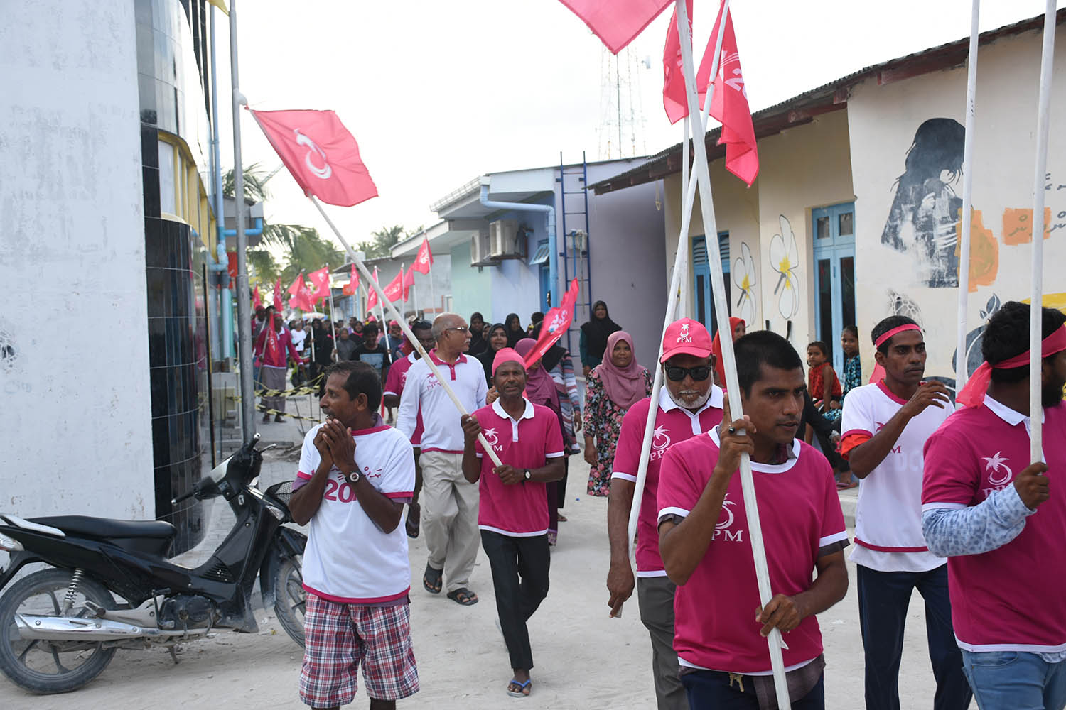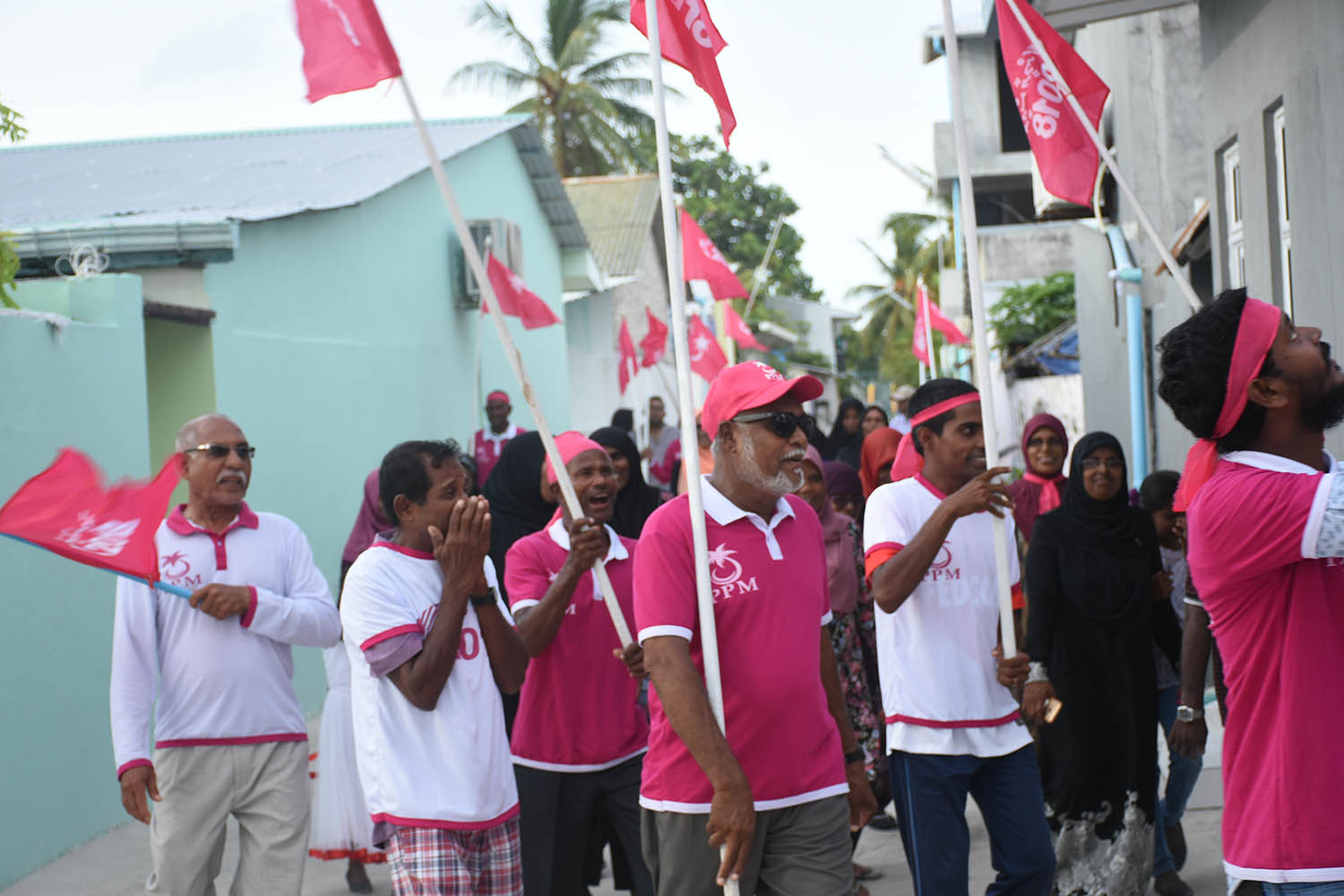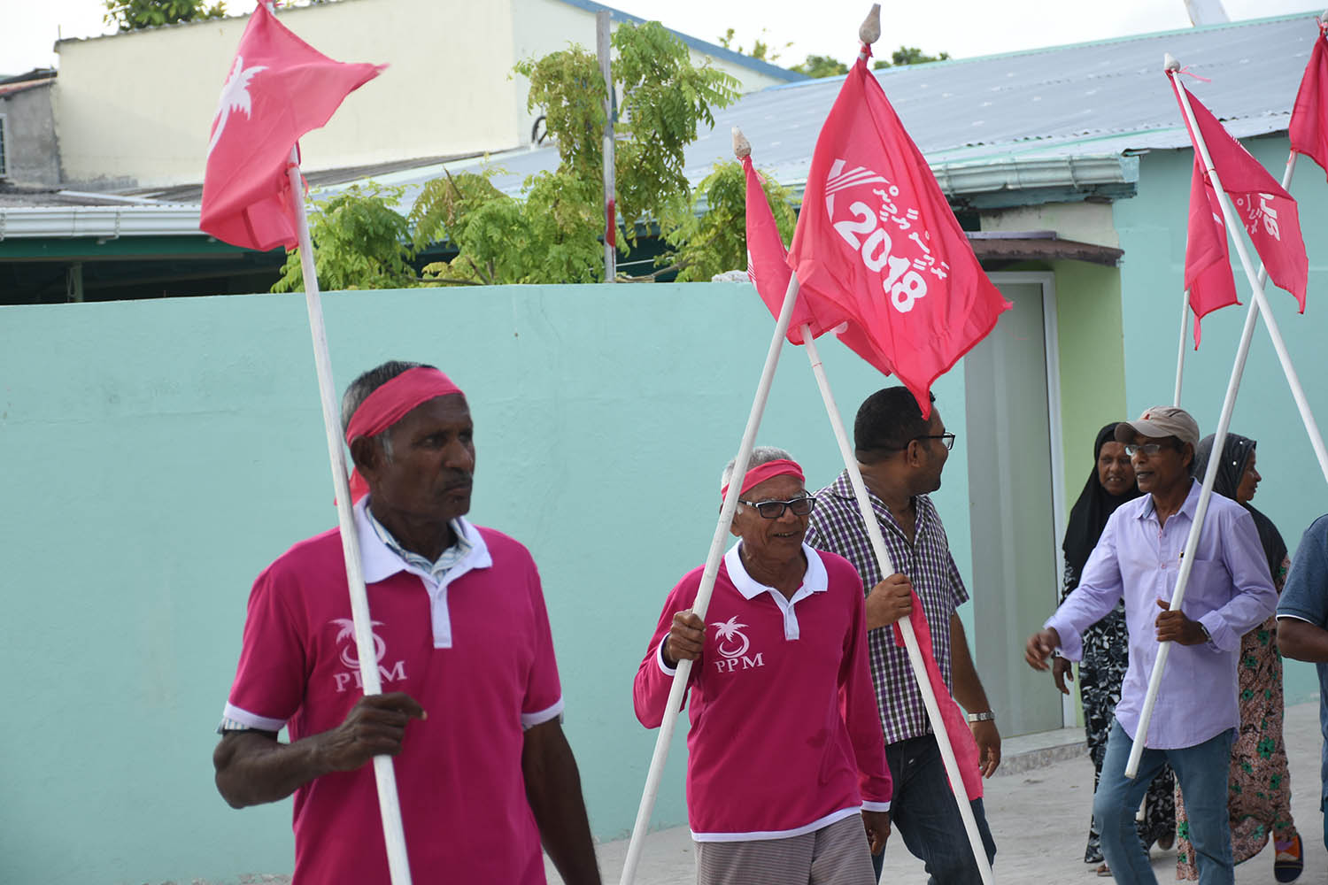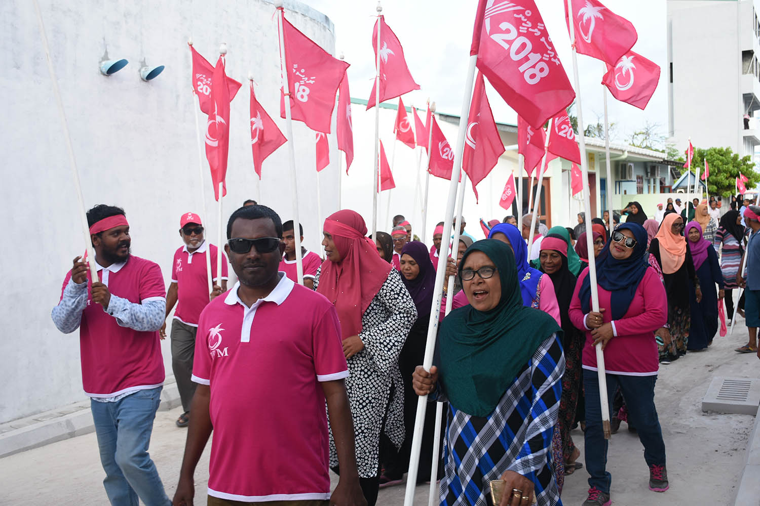 ބ. އޭދަފުށި، އޮގަސްޓް 27، 2018- މި އަހަރުގެ ރިޔާސީ އިންތިޚާބުގައި ޕީޕީއެމުން ވާދަކުރައްވާ ކެންޑިޑޭޓު ރައީސް އަބްދުﷲ ޔާމީންއަށް ތާއީދު ކުރުމުގެ ގޮތުން ޕީޕީއެމް އޭދަފުށީ ގޮފިން ބޭއްވި ހިނގާލުން: މި ހިނގާލުމުގެ ބައިވެރިން ބުނީ އެއްލަކިން ރައީސް ޔާމީން މި އިންތިހާބު ކާމިޔާބުކުރާއްވާނެ ކަމަށް. ހިނގާލުމުގައި 80 ވަރަކަށް މީހުން ބައިވެރިވި .- އީޓީ ފޮޓޯތައް: ތޯރިގް އަބްދުއްރަހްމާން